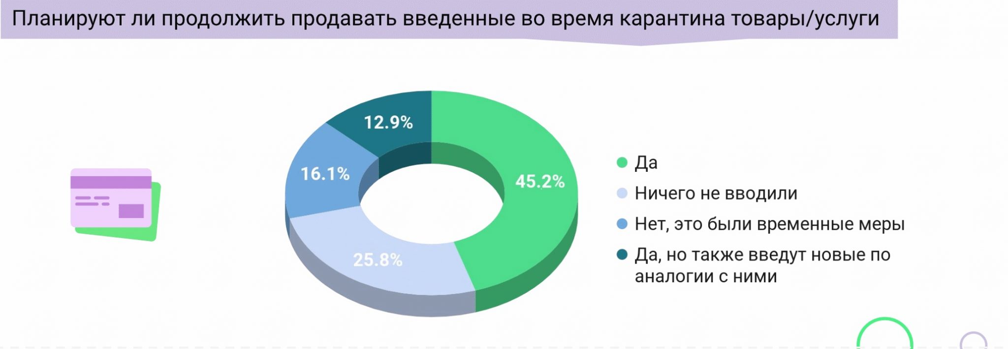 Відповідаючи на запитання про нові послуги або товари, введені компаніями під час карантину, більшість опитаних зазначили онлайн-послуги (консультації, уроки тощо), доставку (в тому числі безконтактну), фінансові пільги (скасування нарахування пені, відстрочка по платежах ) і засоби для дезінфекції. При цьому більшість підприємців планують продавати ці товари та послуги й після карантину.