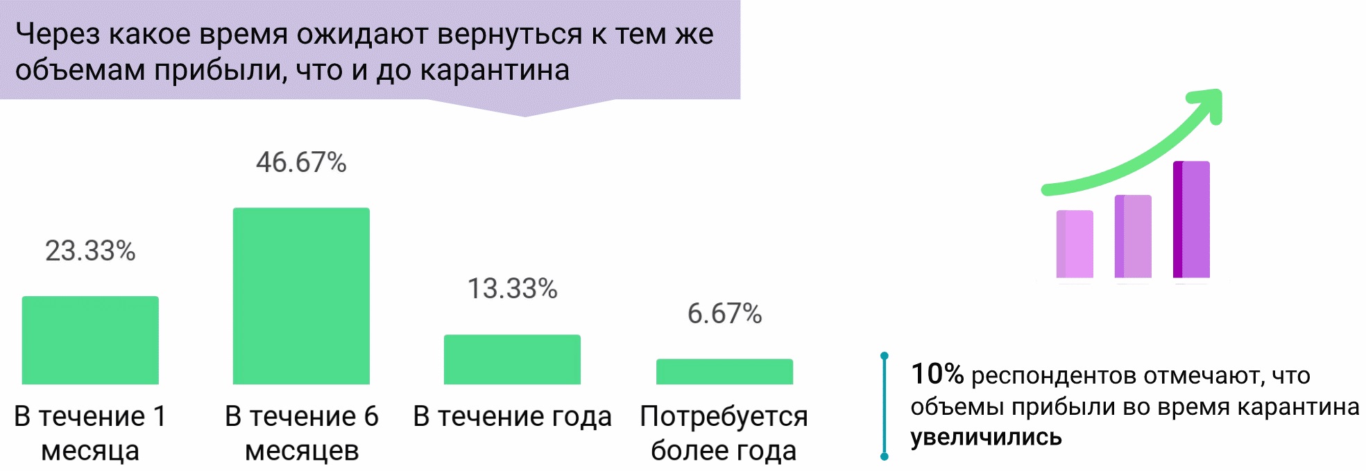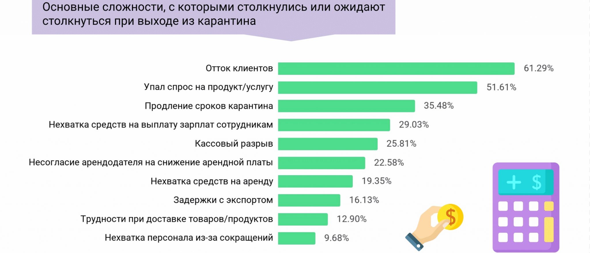 Серед основних труднощів, з якими компанії зіткнулися або очікують зіткнутися при виході з карантину, це відтік клієнтів і падіння попиту на продукти та послуги. У числі найбільш часто згадуваних бізнесом проблем також вказуються продовження термінів карантину, нестача коштів для виплати зарплат і касові розриви.