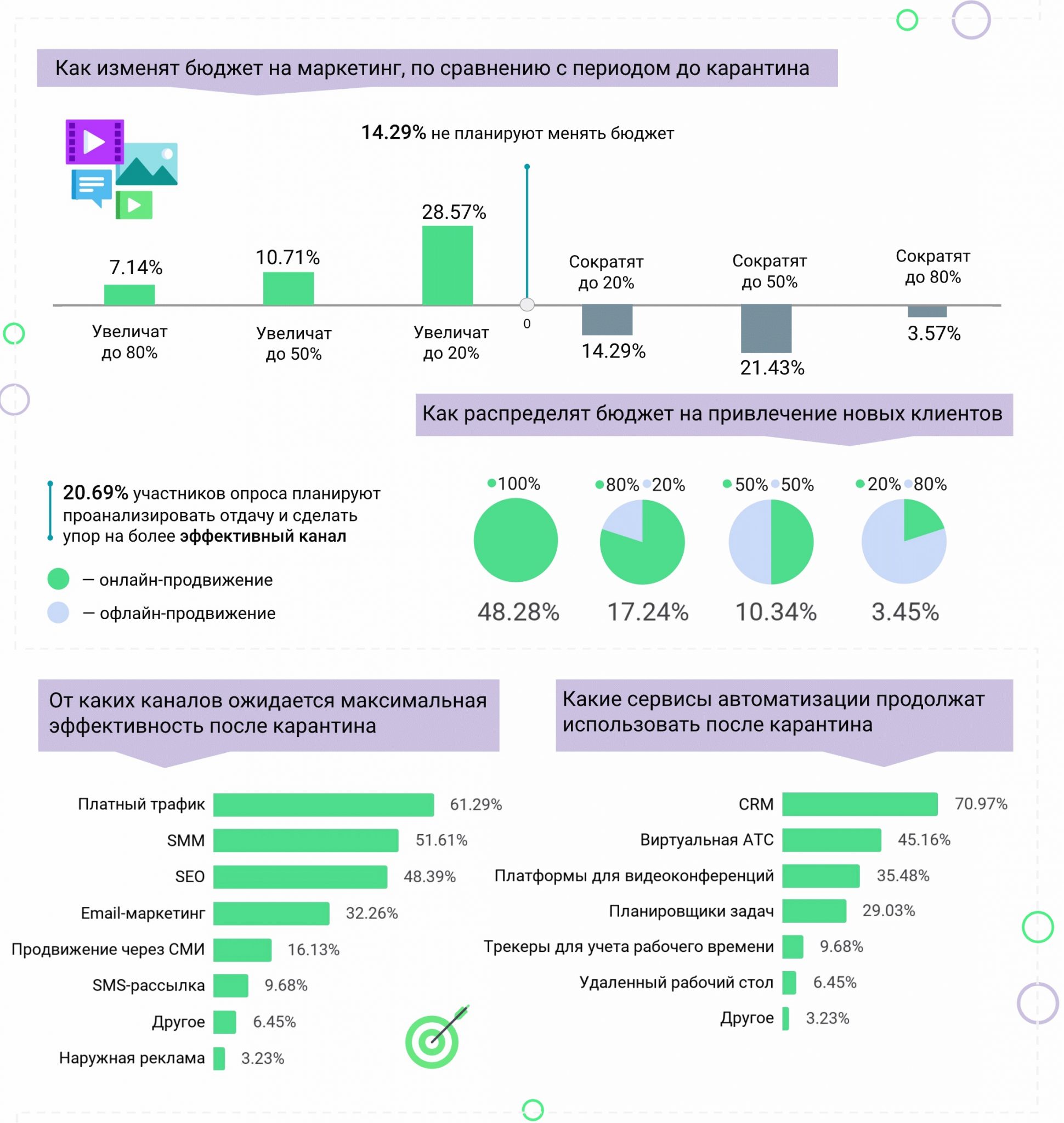 Значна частина опитування також була присвячена зміні бюджетів на маркетинг, розподілу бюджету на залучення нових клієнтів, а також найбільш ефективним каналам і сервісам автоматизації в посткарантинний період.