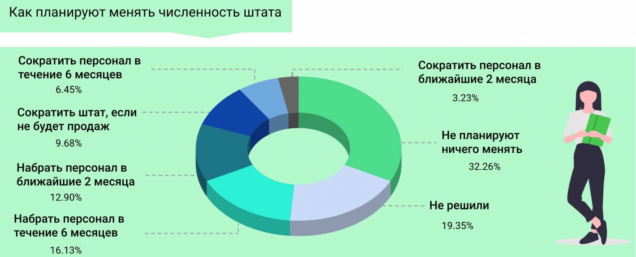Незважаючи на зниження продажів, скорочувати персонал найближчим часом планує не так багато підприємців – менше 10%. Однак ще близько 10% компаній готові до скорочень в тому випадку, якщо продажів не буде і після карантину.