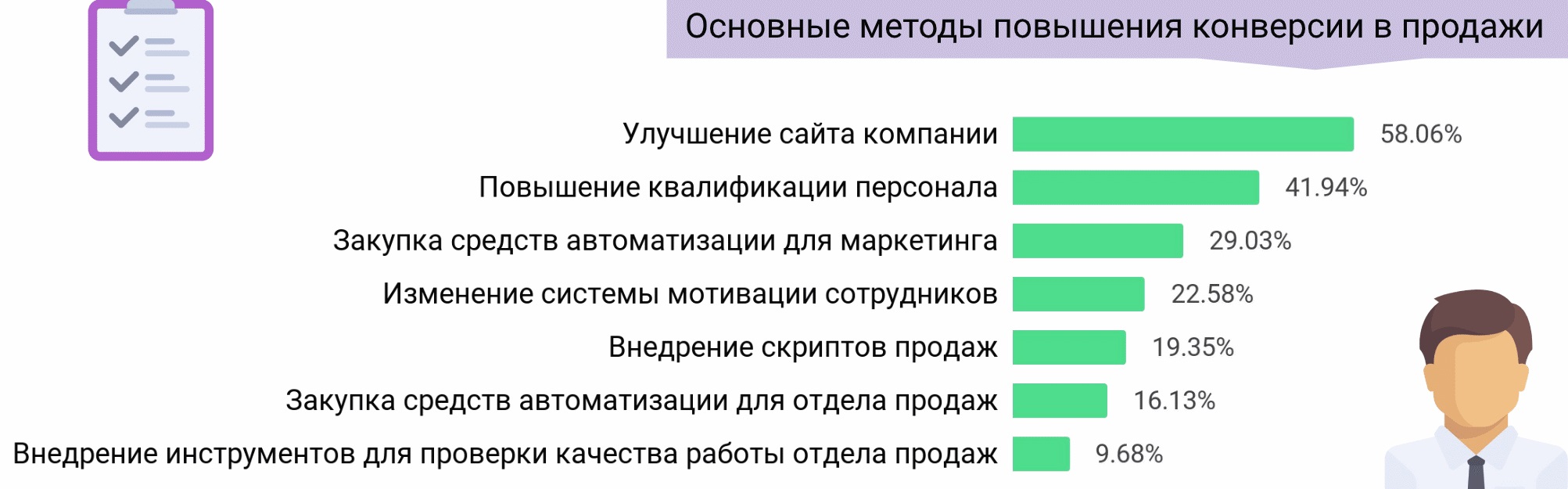 Серед найпопулярніших методів підвищення конверсії в продажі: поліпшення сайту компанії, підвищення кваліфікації співробітників і закупівля засобів автоматизації для маркетингу.