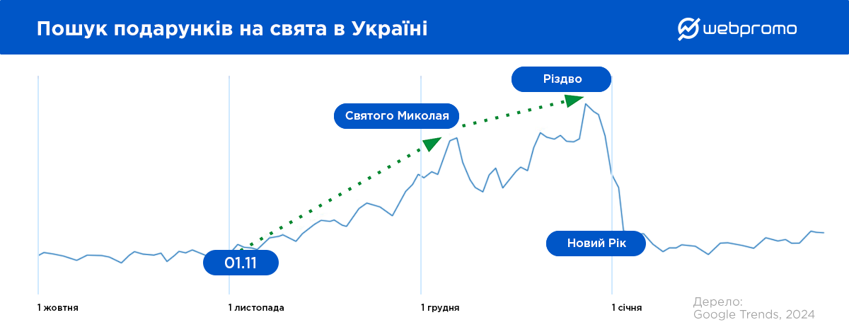 Пошуковий інтерес та кількість промоакцій зростають вже з перших чисел листопада та формують ранній сплеск продажів 11 листопада (Всесвітній день шопінгу).