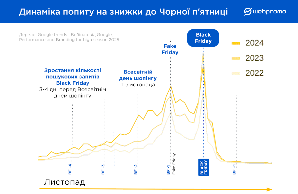 Динаміка інтересу до знижок в Україні відрізняється від західного ринку, що підтверджує аналіз пошукової активності у Google Trends. На противагу іншим країнам, де спостерігаються дві хвилі високої активності (на Чорну п’ятницю та напередодні новорічних свят), в Україні фіксується розтягнуте «плато» високої активності з листопада по січень. Намагаючись захопити увагу покупця до фінального піка, ритейлери часто практикують так звану Fake Friday — серію знижок і промоцій, що охоплюють весь місяць.