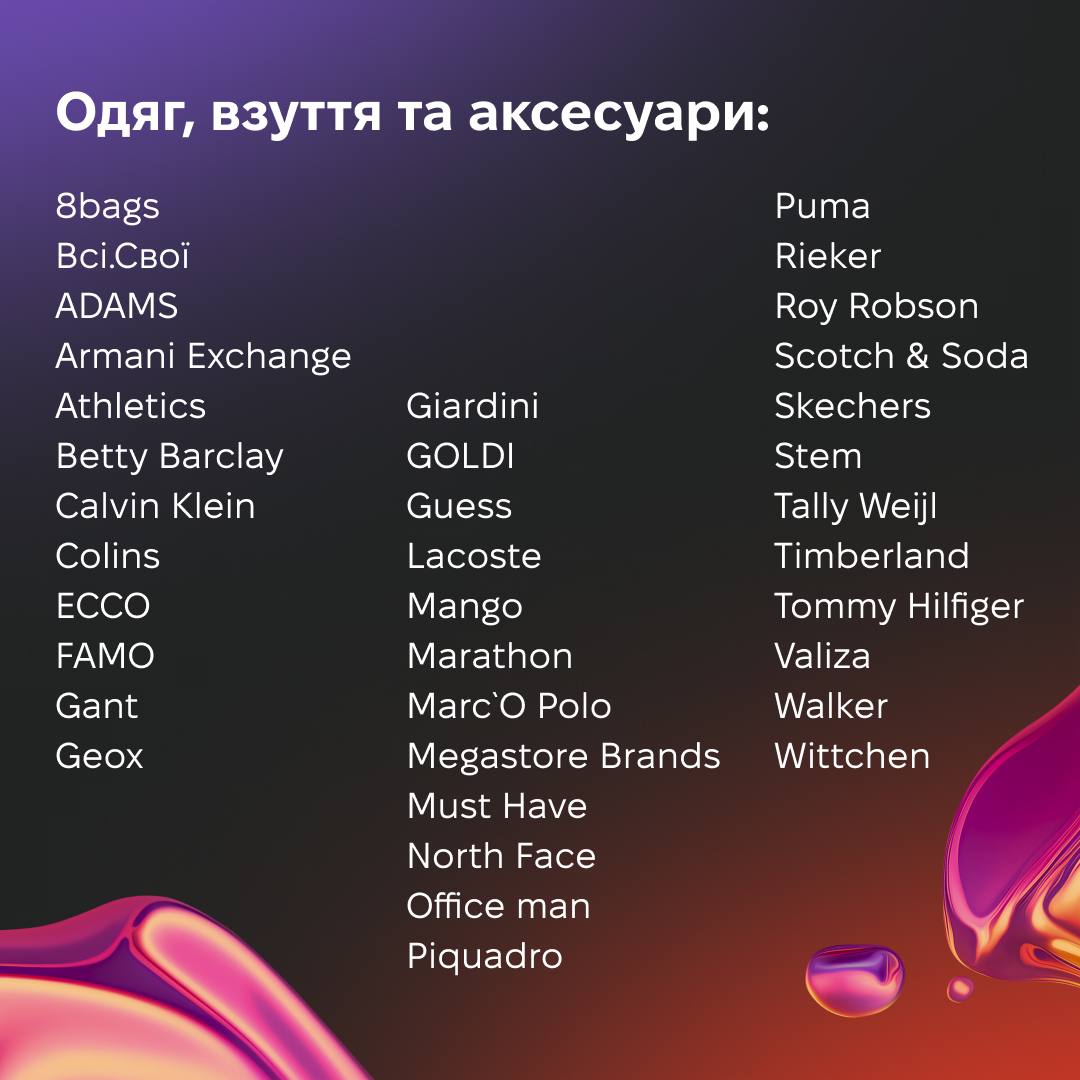 Серед нових відкриттів: Mango, Must Have, Goldi, Rieker, Terranova, Tally Weijl, Roy Robson, Scotch & Soda, Всі. Свої та багато інших. Ось весь список: