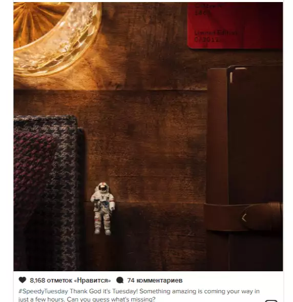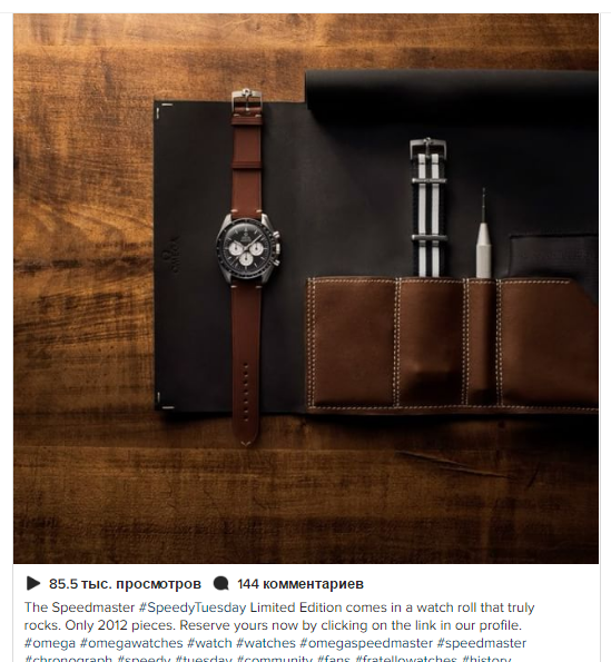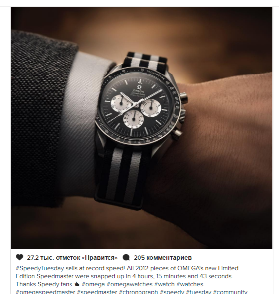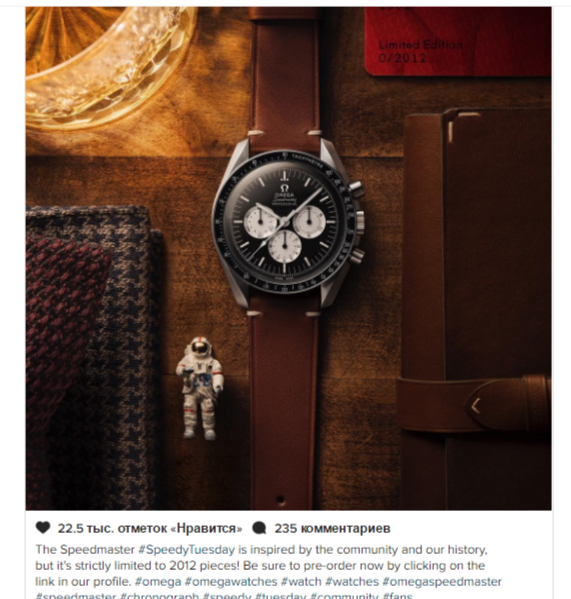 Портал telegra.ph опублікував захоплюючий кейс, який показує, що західні SMM-спеціалісти та маркетологи вийшли на принципово новий рівень роботи з клієнтами. Покупцям пропонувалося придбати годинник моделі Speedmaster “Speedy Tuesday” Limited Edition. Всі моделі (в кількість 2012 штук) розійшлися по світу за 4 години 15 хвилин 43 секунди, принісши бренду 11,7 млн швейцарських франків (близько 11 млн євро).