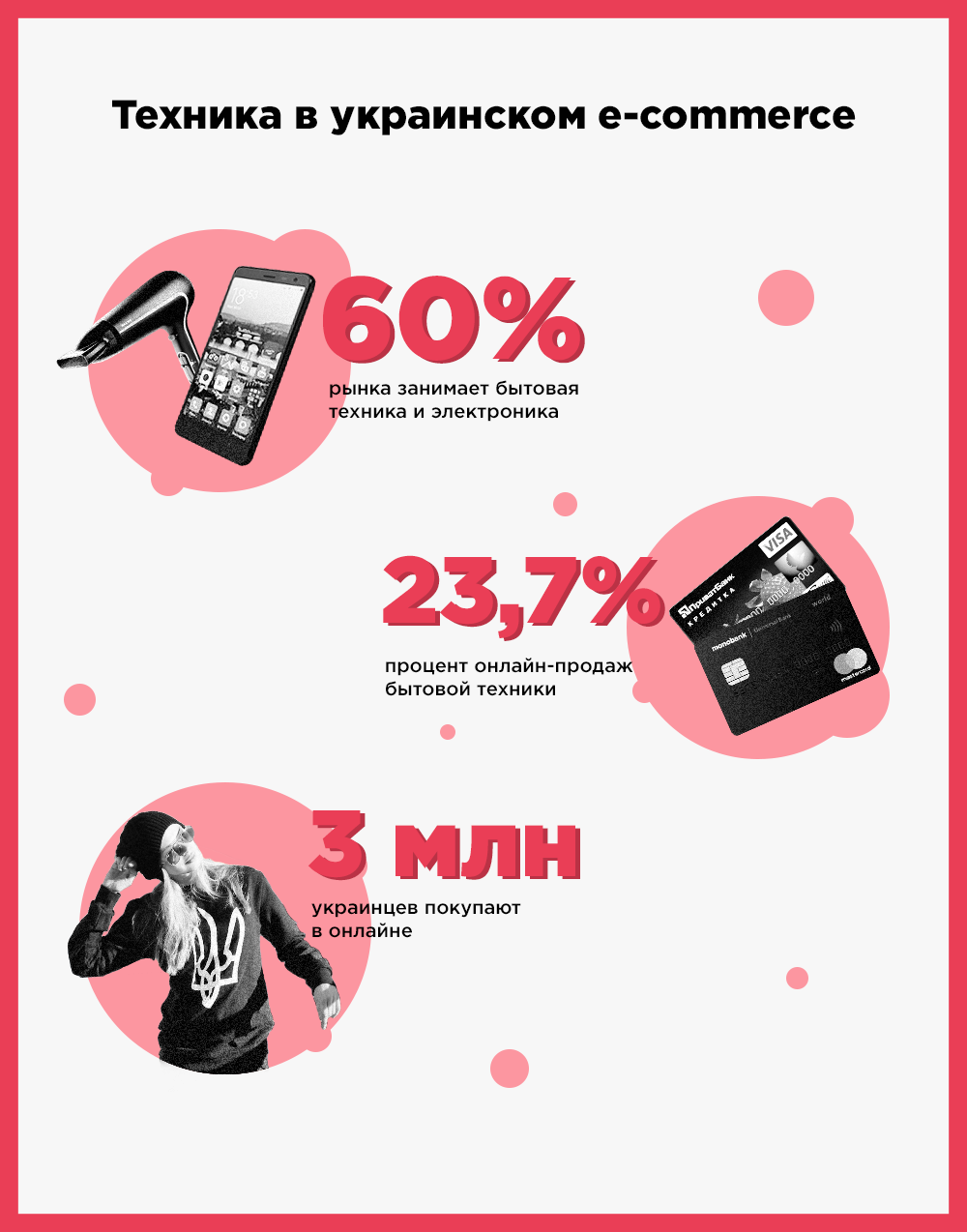 За даними інституту ринкових досліджень GfK, в 2016 році на частку побутової техніки та електроніки прийшлося 60% усього українського e-commerce.