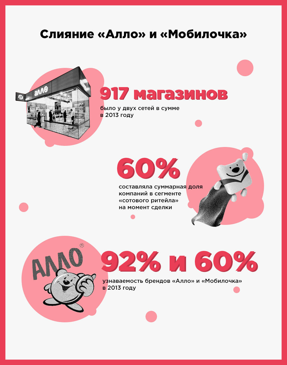 У 2013 році на українському ринку сотового рітейлу пройшла найбільша угода за весь час його існування. АЛЛО, яка на той момент володіла понад 500 магазинами, поглинула мережу Мобілочка, в активі якої було ще 417 магазинів в 149 містах. На момент угоди сумарна частка компаній в сегменті так званого «сотового рітейлу» за оцінкою газети КоммерсантЪ становила 60%. У АЛЛО цю подію називають однією з найважливіших в новітній історії компанії.