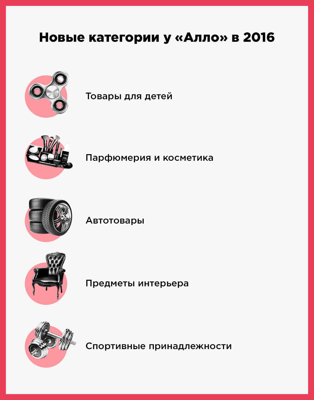 За прогнозами GfK, в подальшому продажі побутової техніки в онлайні сповільнять темпи зростання, а традиційно офлайнові категорії – одяг, взуття, аксесуари, товари для дітей – будуть, навпаки, нарощувати обороти. У АЛЛО цю точку зору також поділяють – в 2016 році компанія вивела в окремі напрямки безліч нових для себе категорій: товари для дітей, парфумерію і косметику, автотовари, предмети інтер’єру, спортивне приладдя. За словами президента Української асоціації директ-маркетингу (УАДМ) Валентина Калашника, розвиток інтернет-магазину від нішевого до маркетплейса необхідний, якщо рітейлер хоче бути успішним. Підтримувати і формувати трафік на окремо взятий нішевий інтернет-магазин досить складно.