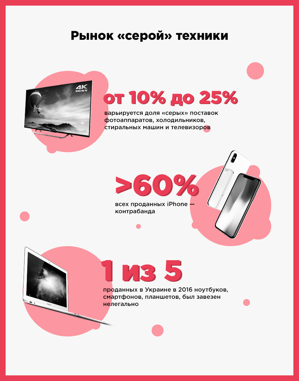 За даними GfK, кожен п’ятий планшет, смартфон і ноутбук, який продавався в Україні в 2016 році, був завезений нелегально. Частка «сірих» поставок фотоапаратів, холодильників, пральних машин і телевізорів, варіюється від 25% до 10%.