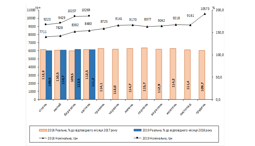 Індекс реальної заробітної плати у квітні порівняно з березнем 2019 року становив 99,2%, а відносно квітня 2018 року – 111,2%.