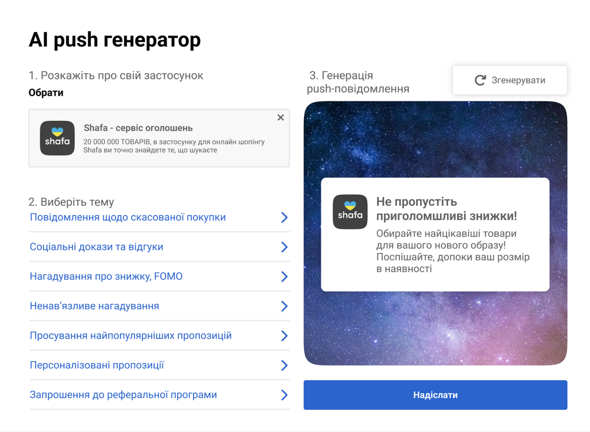 3. Генерація push – АІ в CDP eSputnik дозволяє користувачам швидко й автоматично створювати пуш-повідомлення (назва, текстове наповнення) на основі даних про ваш мобільний застосунок і заготовлених ідей.