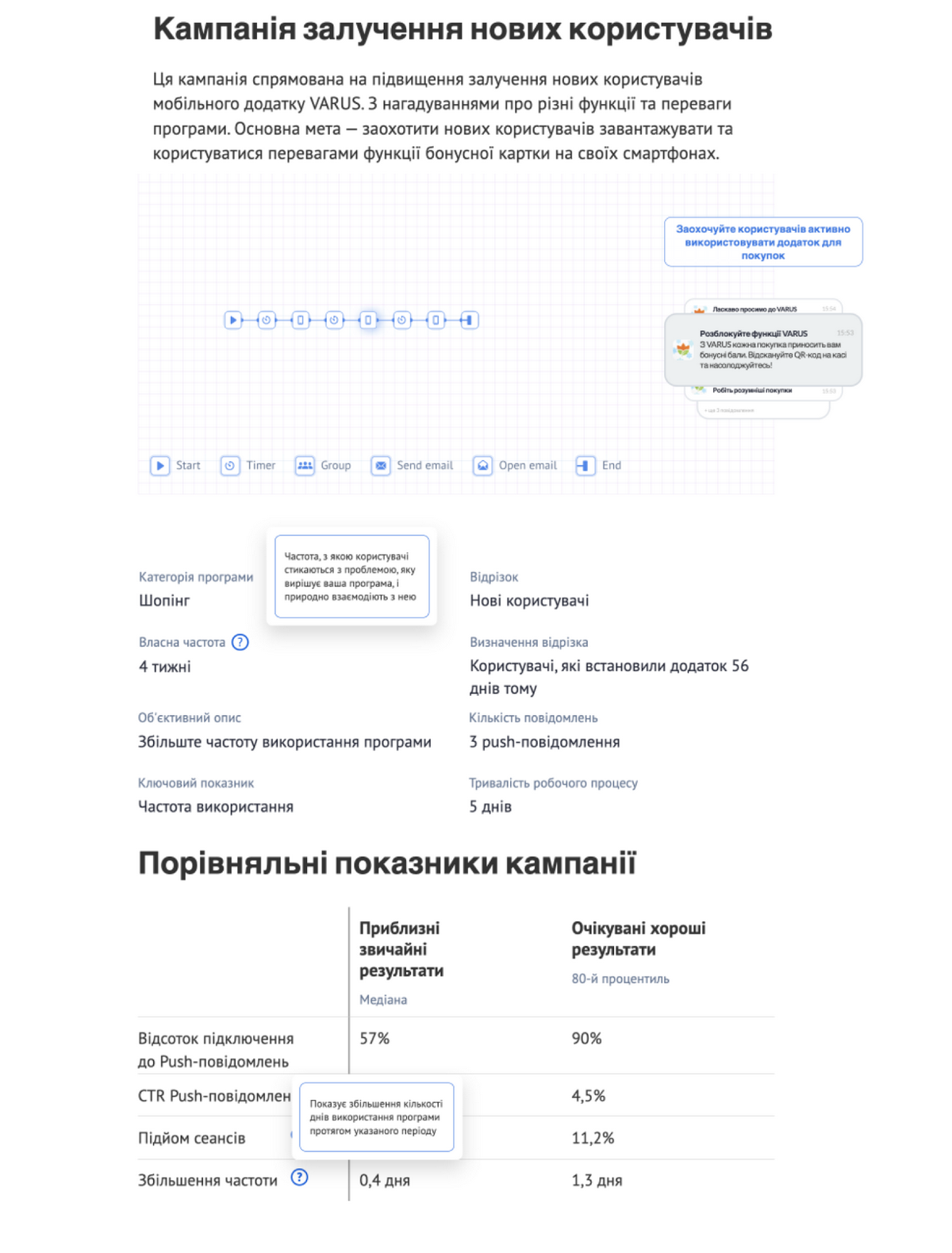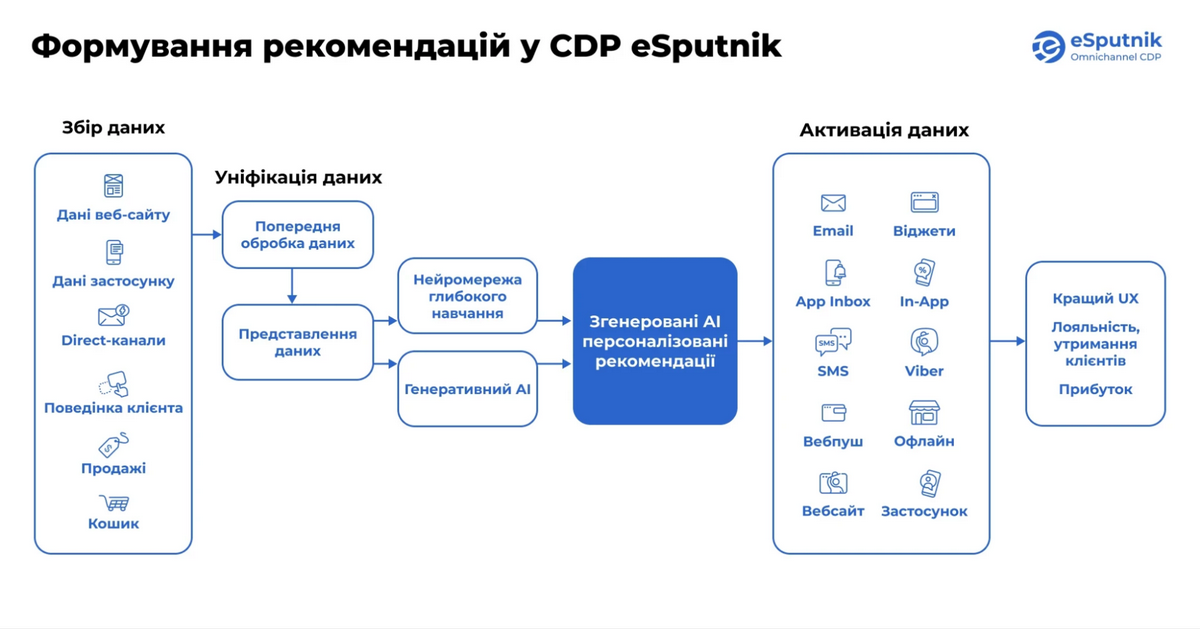 - Омніканальне використання – готові рекомендації відображаються на різних сторінках сайту, у застосунку, використовуються в direct-каналах (email, push-повідомлення, App Inbox, Viber).