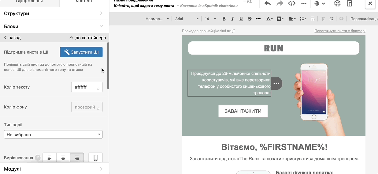 2. Наповнення блоків в e-mail – генеративний АІ в редакторі eSputnik автоматично опрацьовує контент і наповнює змінні в модулях. Функціональність пришвидшує створення листів і робить їх ще ефективнішим. Для формування вмісту достатньо: