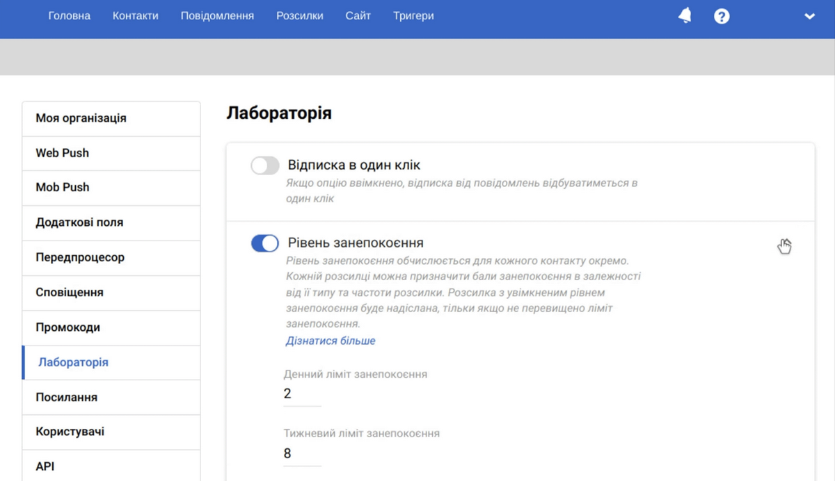 Така щільність комунікацій надмірна та може призвести до роздратування клієнта. Щоб уникнути цього, в eSputnik можна встановити рівень занепокоєння. Кожен контакт отримуватиме повідомлення на основі типу емейла та кількості сегментів, до яких він входить.