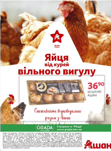 Ашан розпочав продаж яєць від курей вільного вигулу у 2017 році, коли був запущений проєкт Фермерські Товари. На початку цього року ми запустили cage-free під власним брендом Ашан – Золота Пташка. Наразі немає можливості забезпечити необхідні об’єми для всіх наших клієнтів, враховуючи купівельну спроможність, що на жаль, падає. Однак ми продовжуємо і надалі шукати українські господарства та промислових виробників, що займаються етичним фермерством або хотіли б його розвивати.