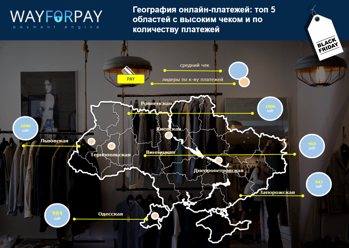 У топ-5 областей за кількістю онлайн оплат в Чорну п’ятницю потрапили Київська, Тернопільська, Одеська, Львівська та Дніпропетровська області. При цьому п’ятірка лідерів за середнім чеком інша. Наприклад, у Львівській області середня сума покупки майже на 30% перевищувала розмір середнього чека по Україні.