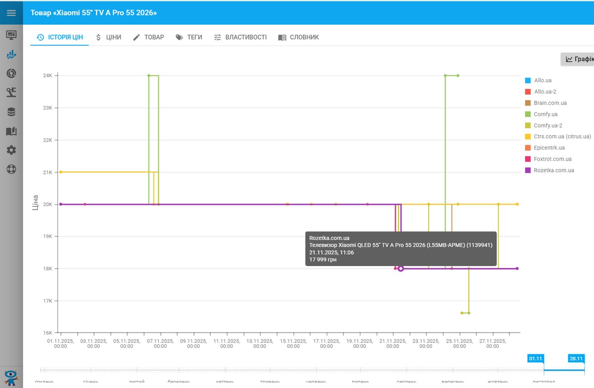 Графік показує цікаву картину: майже всі гравці ринку підвищили ціну напередодні Чорної пʼятниці (починаючи з 11 листопада) і знизили її перед акційним тижнем — з 15 листопада. Виняток — Allo й Цитрус, що утримували одну ціну впродовж усього періоду.