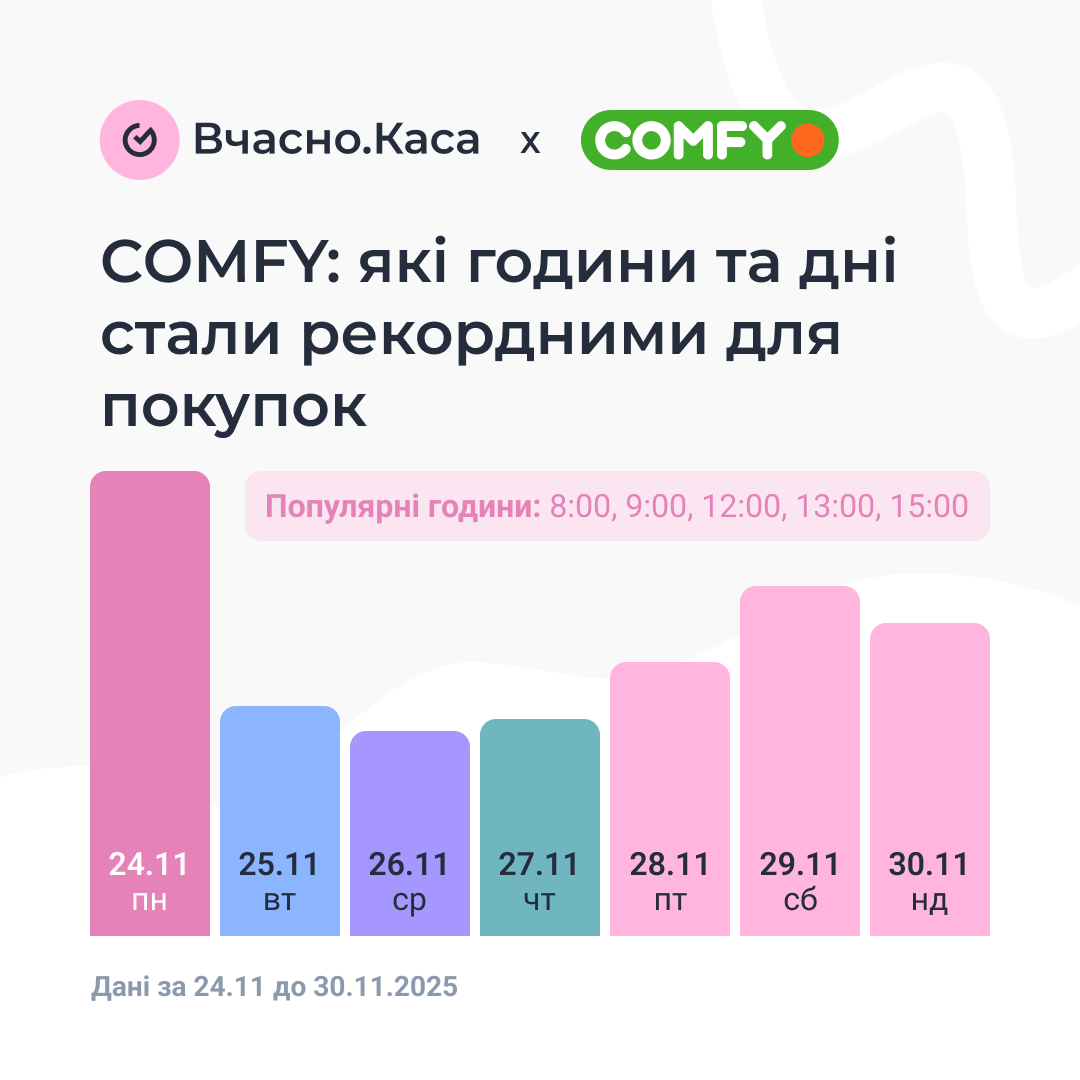Техніка стабільно залишається у топі вибору українських покупців. Під час Чорної п’ятниці у Comfy найбільший чек сягнув майже 250 000 грн, а найдовший містив 28 товарів. Найактивніший час для покупок — ранок з 8:00 до 10:00 та обідній період з 12:00 до 15:00. Найпопулярнішими днями за кількістю покупок стали понеділок, 24 листопада, а також вихідні — 29 і 30 листопада. Менше купували у будні, а саме в середу та четвер.