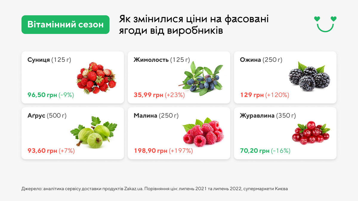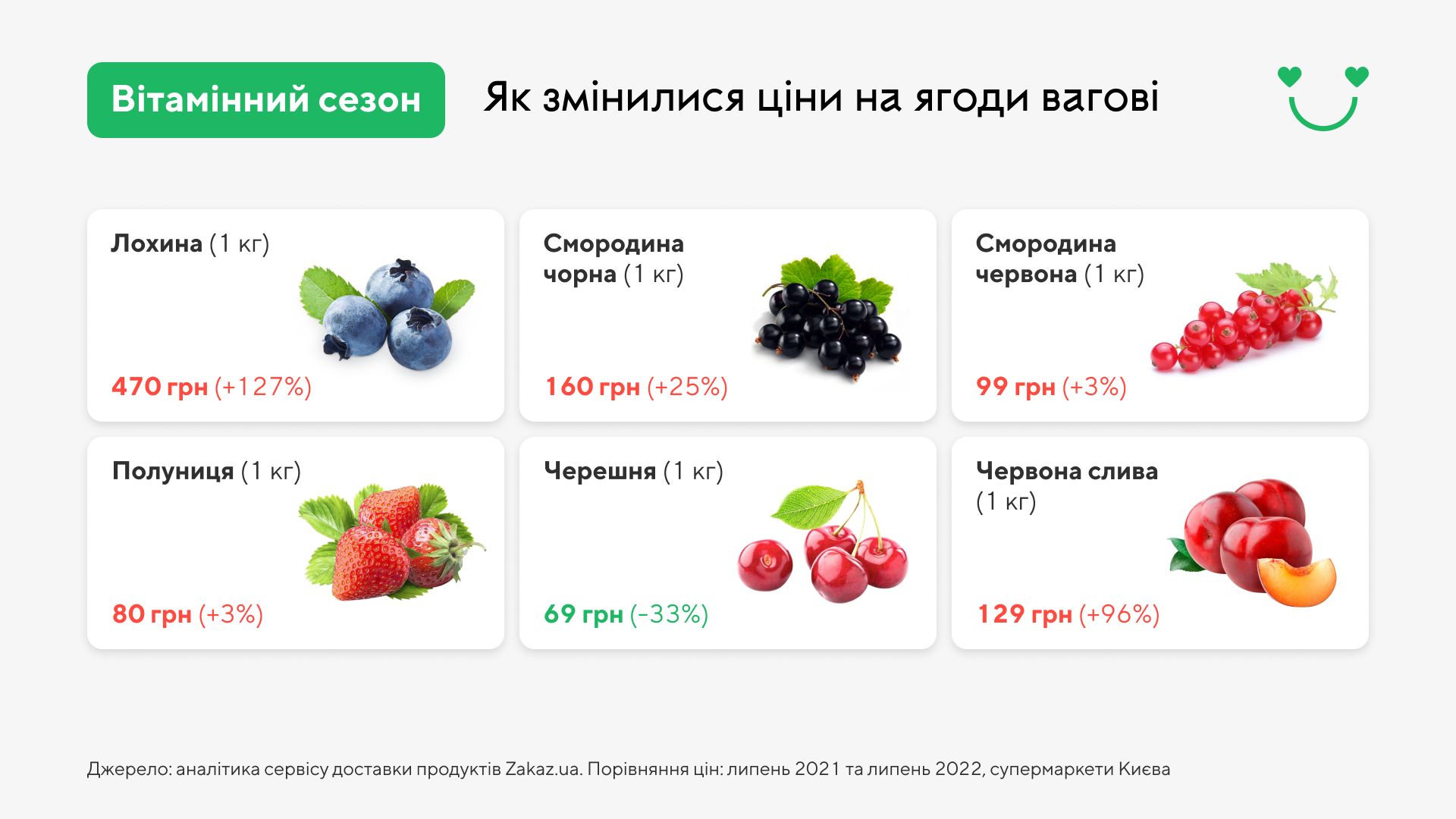 Суттєве подорожчання спіткало майже весь асортимент ягід. За даними аналітиків Zakaz.ua, найбільше підскочила у ціні малина, майже втричі – на 197%. На поличках супермаркетів у фасованому вигляді вона коштує 198 грн за 250 г. Також значно зросла ціна на популярну в останні роки серед українців ягоду лохину. Її можна придбати за 470 грн/кг, що на 127% більше, ніж у липні 2021 року. Зокрема значно зросли у ціні наступні ягоди: ожина – 129 грн за 250 г (на 120%), червона слива – 129 грн за 1 кг (на 96%), чорна смородина – 160 грн за 1 кг (на 25%), жимолость – 35,99 грн за 125 г (на 23%).