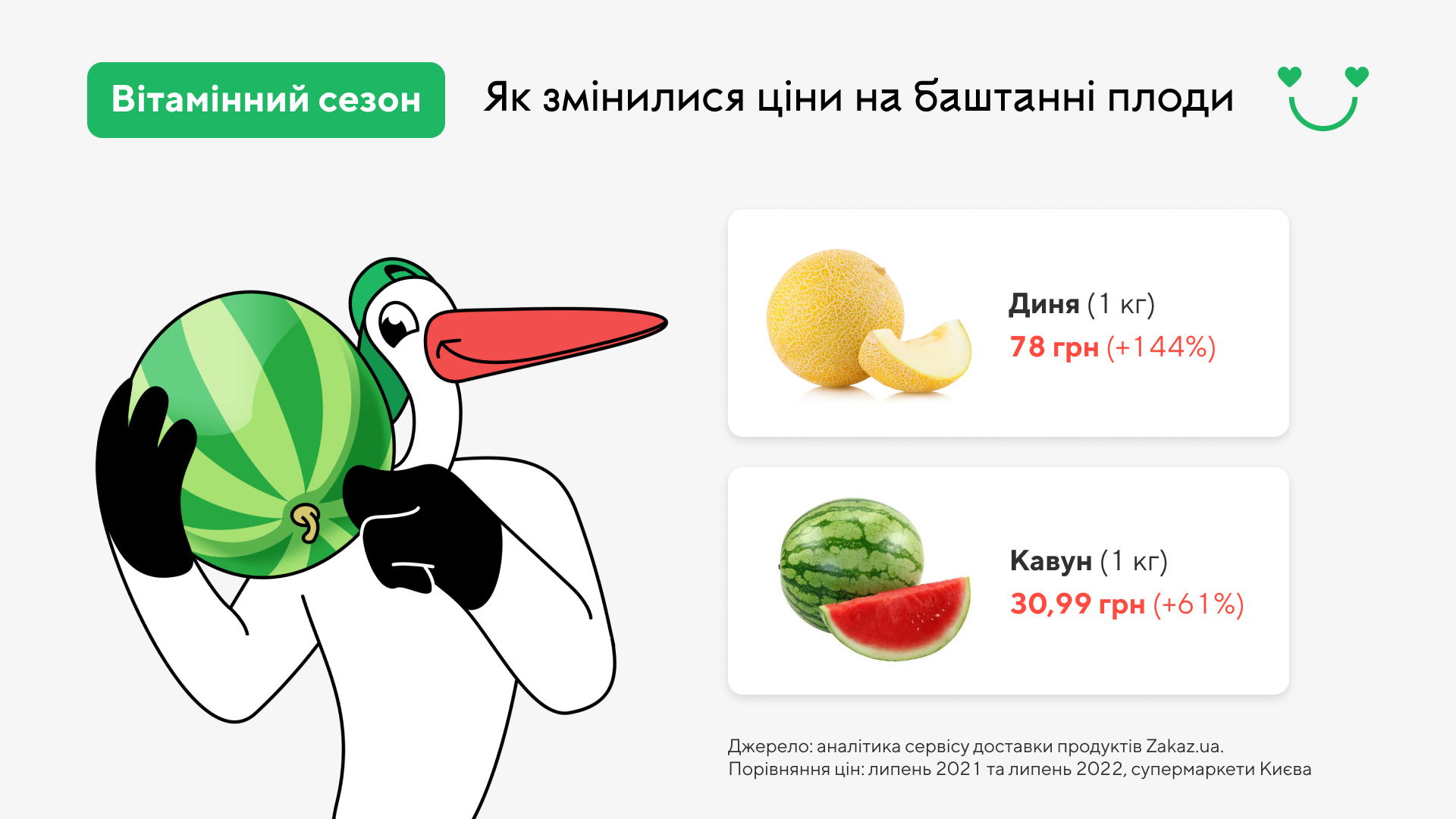 Кавуни та дині також вже з’явилися в магазинах, та поки їх купують не дуже охоче. Люди чекають на серпневий урожай, сподіваючись на нижчі ціни. Наразі вартість кавуна у столичних супермаркетах у середньому становить 30,99 грн за кілограм, що на 61% вище, ніж у липні минулого року. Найбільше підскочила ціна на диню – на 144%.
