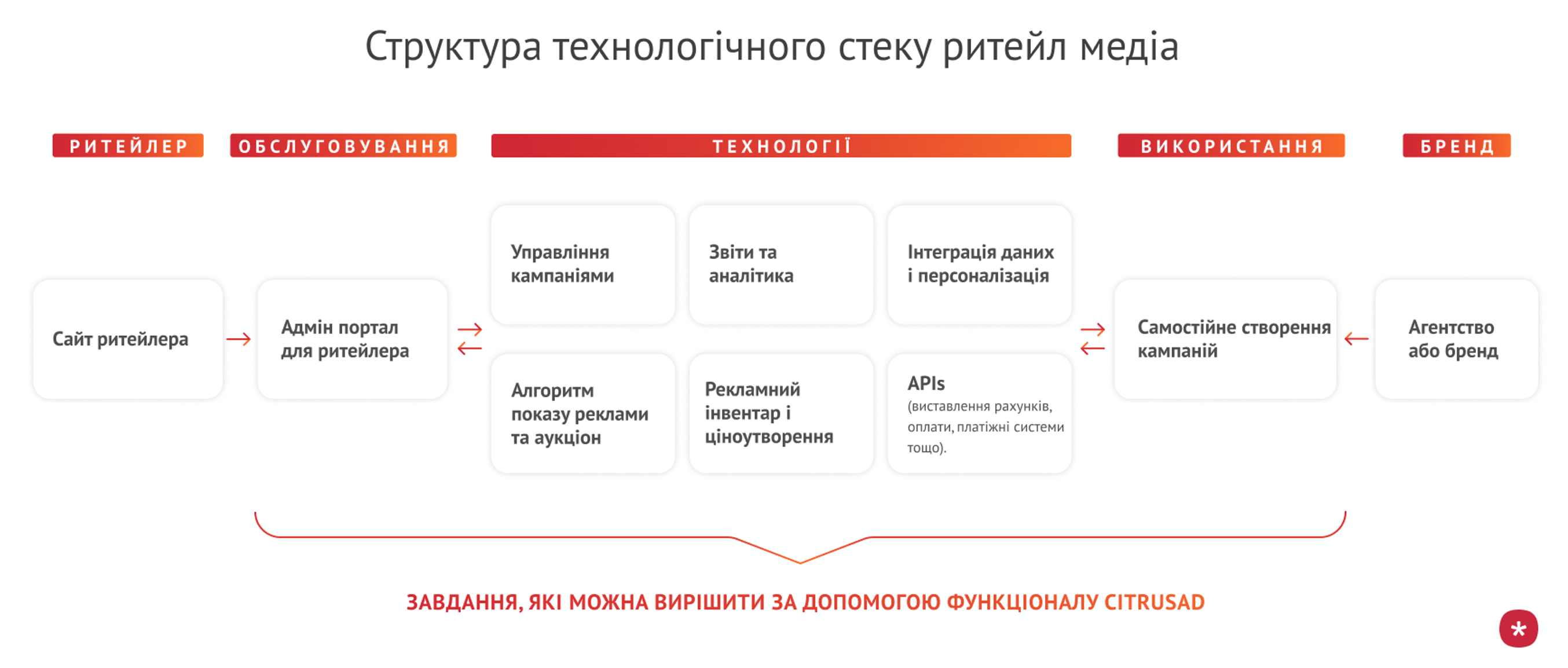 З графіка видно, як різні гравці e-commerce сфери взаємодіють між собою за допомогою рітейл медіа платформи. Слово “технологія” часто звучить занадто узагальнено, але воно має за собою широкий функціонал, який дозволяє виконувати, автоматизувати та полегшувати цілу низку завдань та функцій. Наприклад, технологія CitrusAd дозволяє налаштовувати та керувати рекламними кампаніями в одному інтерфейсі, інтегрувати у платформу будь-які дані, отримувати аналітику та автоматизувати створення звітів.