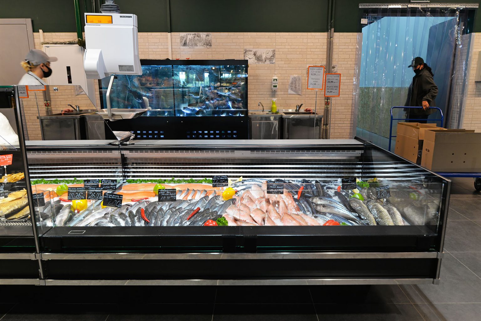 Також є відділ рибних копченостей, де процес приготування в коптильні на деревній трісці проходить прямо перед покупцями.