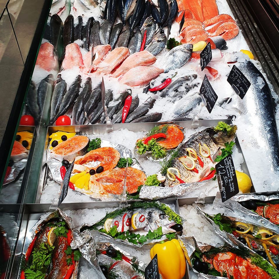 В рыбном отделе представлена свежая речная рыба: карп, щука и судак. И морская: лосось, тунец, филе трески или морского окуня.
