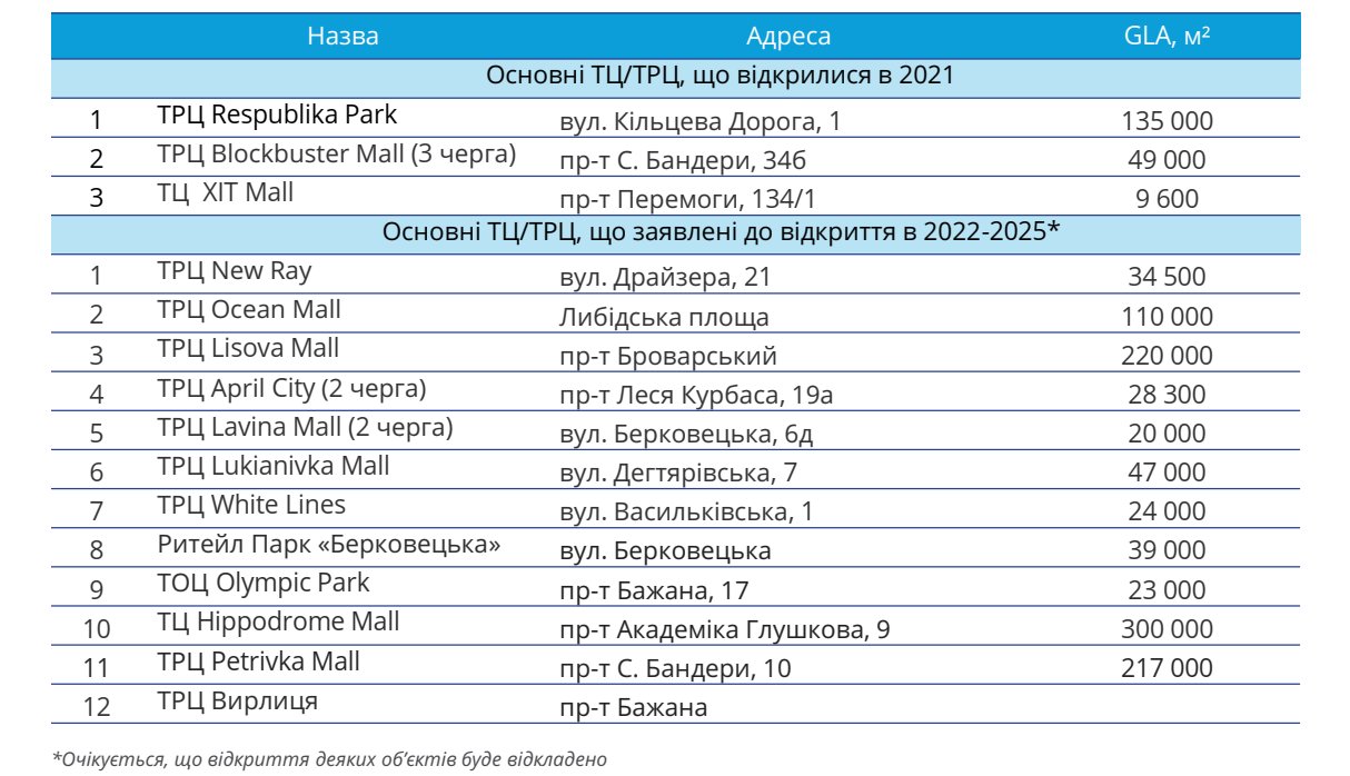 Процес насичення Києва торговими площами продовжується і в новому, 2022 році. Серед проектів на стадії активної реалізації, запуск яких є перспективою найближчих років, варто виділити ТРЦ Ocean Mall, ТРЦ Lukianivka Mall, ТРЦ White Lines і ТРЦ April City.