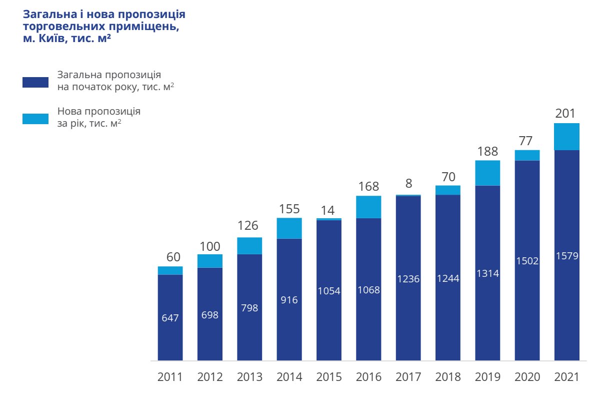 Київ лідирує в Україні за рівнем насиченості торговельними площами: не зважаючи на важкі часи, нові проекти в місті продовжують поступово реалізовуватися. Станом на кінець 2021 року показник насиченості сягнув 605 кв. м на 1000 жителів.