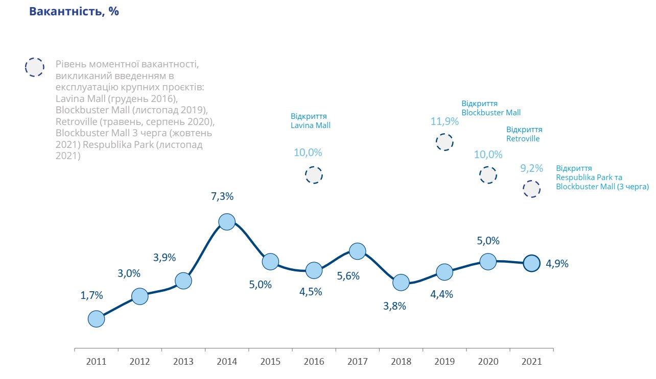 Натомість у сучасних якісних проектах вакантність або не змінилася критично, або навіть знизилася. Це обумовлено високим попитом на площі з боку рітейлерів у таких локаціях через розуміння їх перспектив. На кінець 2021 року показник вакантності без урахування ТРЦ Respublika Park та Blockbuster Mall дещо знизився з 5% до 4,9%, у порівнянні з 2020 роком. Незважаючи на відкриття нових великих проектів, драматичного зростання показника вакантності не спостерігалося. Так, у ТРЦ Respublika Park на момент відкриття було 61% працюючих магазинів, а на кінець року показник заповнбваності досяг 76%. В свою чергу, на кінець 2021 року заповнюваність Blockbuster Mall (2 черга), враховуючи підписані угоди, становила 79%, а Blockbuster Mall (3 черга) – 55%. Відповідно загальний показник вакантності з урахуванням ТРЦ Respublika Park і Blockbuster Mall становив 9,2%.