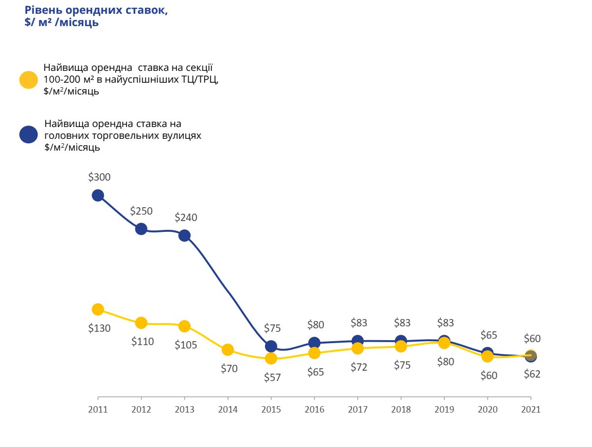 Орендні ставки за 10 років суттєво знизилися. Якщо в 2011-му найвища щомісячна ставка оренди на головних торгових вулицях Києва сягала $300 за кв. м, то зараз вона не більше $60 за кв. м. Це вже нижче навіть за ставку оренду секції в ТРЦ площею 100-200 кв. м, яка в 2021 році становила $62 за кв. м.