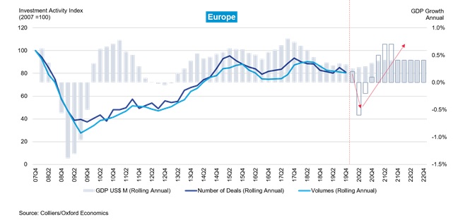 На ринках капіталів імовірна перерва в активності, проте ключові гравці будуть продовжувати інвестиційну активність, зосередившись на «безпечних» ринках. На інвестиційну активність, крім волатильності курсів валют протягом другого і третього кварталів 2020 року, вплине і неможливість фізично відвідувати активи. Ринки, що залежать від іноземного капіталу, можуть зіткнутися зі скороченням інвестиційної активності.