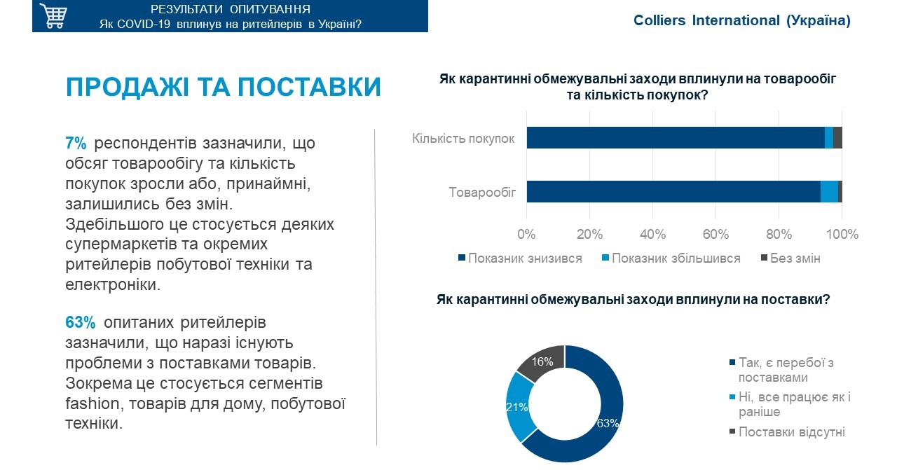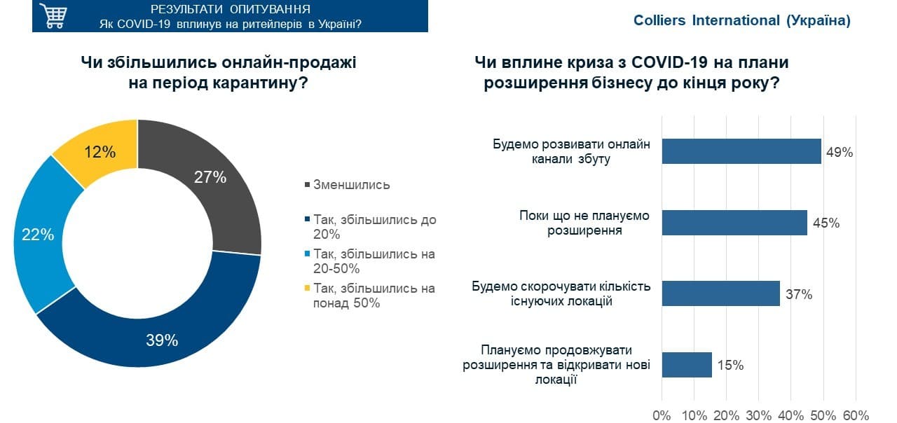 Згідно з результатами опитування Colliers International (Україна) в травні 2020 року, 55% рітейлерів закрили всі свої локації на період карантину, 13% респондентів лишились працювати в форматі «точки видачі», 38% – зазначили, що стали розвивають онлайн-канали збуту.