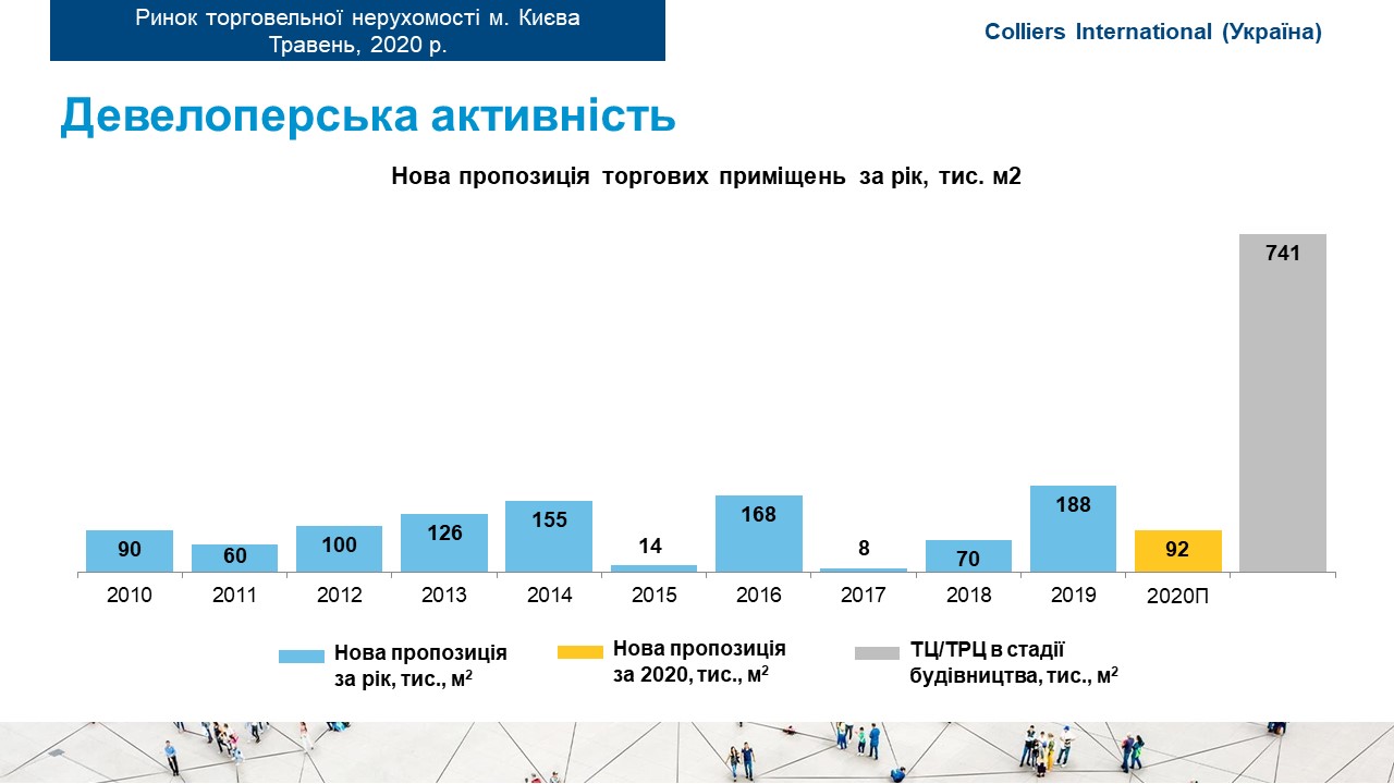 Станом на перший квартал 2020 року на активній стадії будівництва в Україні знаходились 11 об’єктів, орендною площею понад 830 000 кв. м з анонсованими термінами відкриття у 2020-23 роках. Ймовірно, частина з них можуть перенести терміни відкриття. Власники проектів, будівництво яких ще не почалося, займуть вичікувальну позицію.