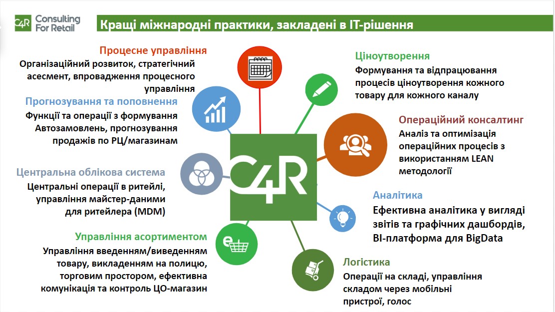 Ми пропонуємо комплексний підхід: спочатку допомагаємо вибудувати бізнес-процеси, під які вже підбираємо відповідні міжнародні бізнес-рішення з програмування, автозамовлення, логістики, управління операційними процесами в магазині тощо. Саме такий підхід дозволяє ефективно вирішувати актуальні задачі рітейлерів і допомагає їм швидко та якісно масштабуватись.