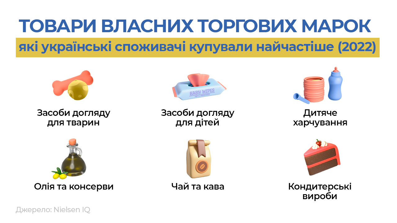 Лідери за обсягом світових продажів в категоріях власних торгових марок у 2021 році: харчові продукти ($40,4 млрд), товари загального використання ($25,2 млрд), м’ясні вироби ($22,3 млрд), товари для здоров’я ($17 млрд). Дитяче харчування відзначається одним із найвищих темпів зростання продажів.