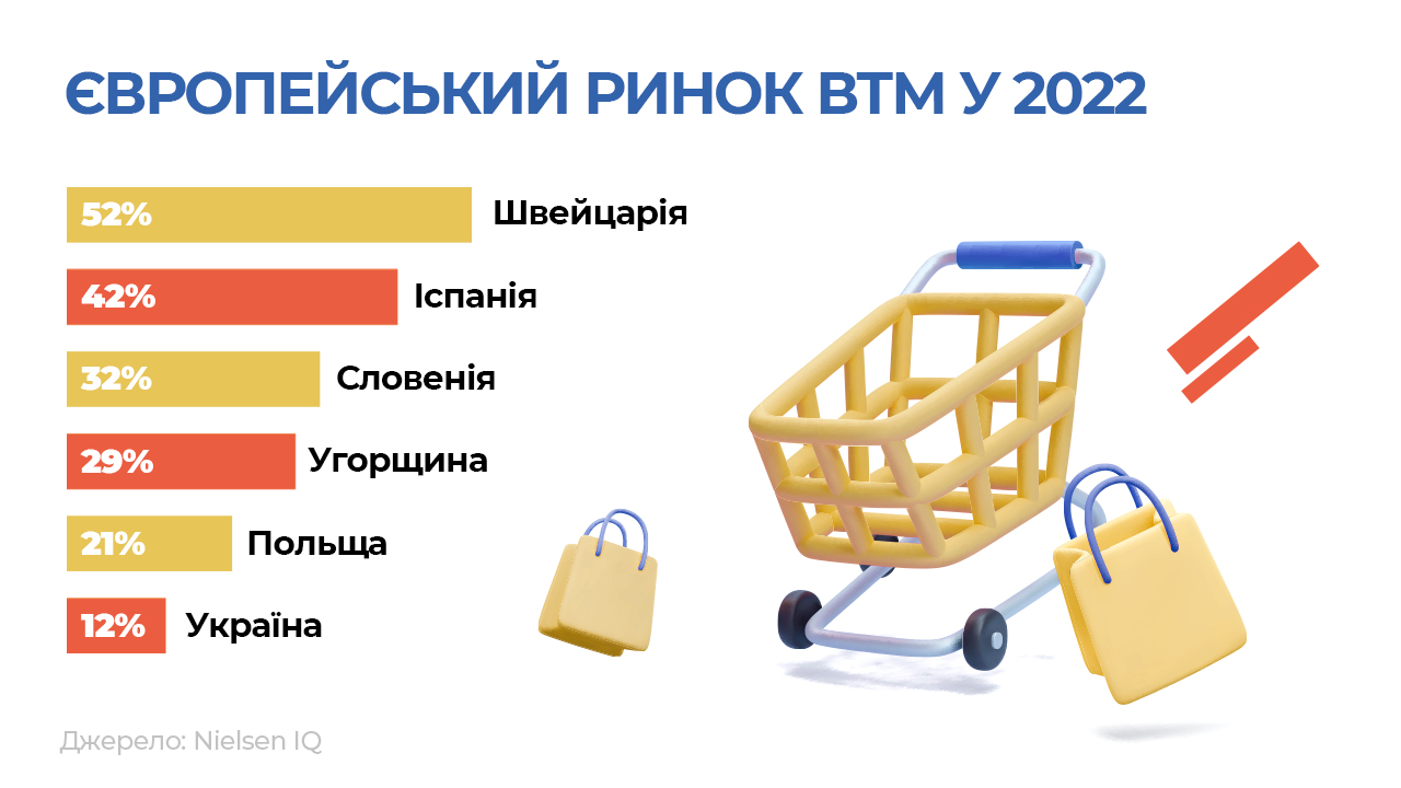 – Відповідно до дослідження NielsenIQ у другому кварталі 2022 року, значна присутність власних торгових марок на європейському ринку відводиться Словенії (32%), Угорщині (29%), Туреччині (29%) та Польщі (21%). Іспанія стала другим за важливістю ринком для private label (42%), перше місце залишається у Швейцарії (52%).