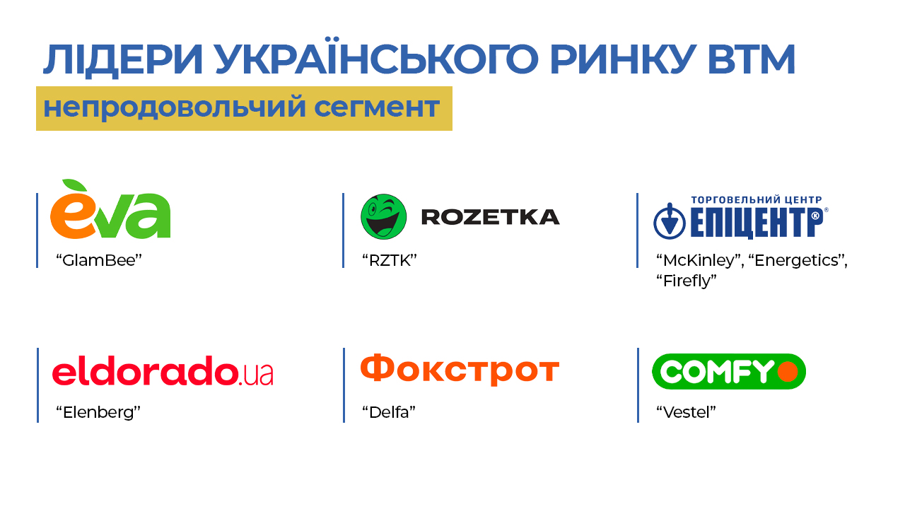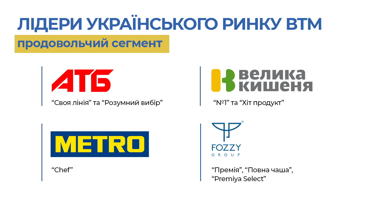 Лідерами на ринку серед власних торгових марок є АТБ-маркет з річним товарообігом 28,1 млрд грн, Fozzy Group, до якої відносяться Сільпо, Фора, Fozzy C&C та Thrash! Траш! з річним товарообігом 23,5 мдрд грн, Metro Cash & Carry Україна з річним товарообігом 9,5 млрд грн, і ПАТ “Рітейл Груп”, до якої відноситься Велмарт і Велика Кишеня та має річний товарообіг 5,11 млрд грн.