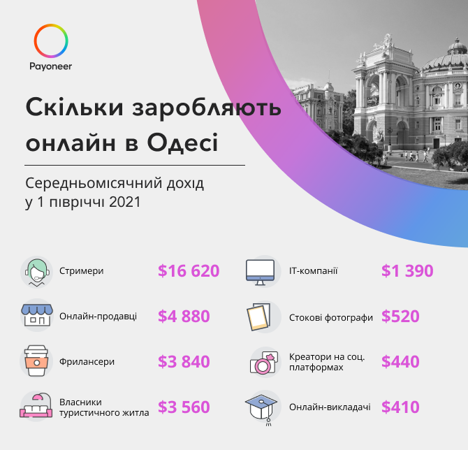 Одеса має першість одразу в трьох категоріях: стримінг, фриланс і оренда туристичного житла. Так, у першому півріччі 2021 року live-трансляції принесли одеситам у середньому $16 620 на місяць, що майже у 6 разів більше, аніж торік. На фрилансі жителі “перлини біля моря” заробили в середньому $23 030 за півроку, або $3840 на місяць.