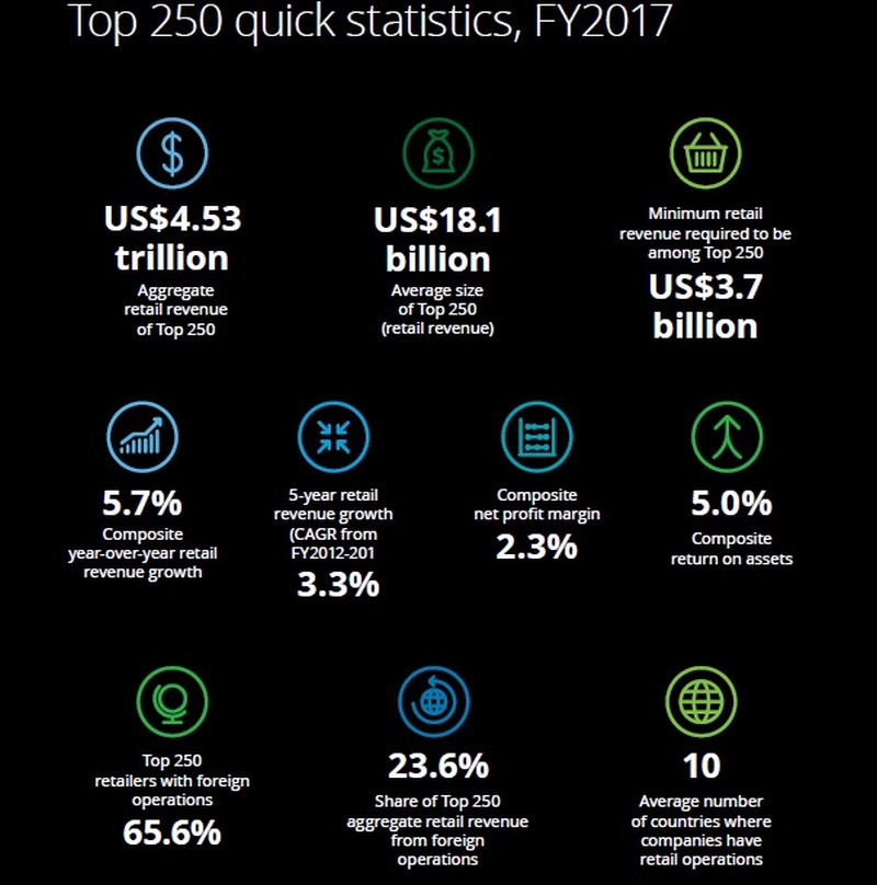Сукупний дохід від роздрібної торгівлі для 250 найбільших рітейлерів світу в 2017 фінансовому році склав $4,53 трлн, при середньому розмірі доходу в $18,1 млрд на компанію. Роздрібна виручка збільшилася для 83% з 250 найбільших світових рітейлерів (208 компаній). Найбільше великих рітейлерів знаходиться в Європі – 87 компаній, що становить 34,8% від загального їх числа, а їх частка в доході 250 найбільших рітейлерів дорівнює 33,8%.