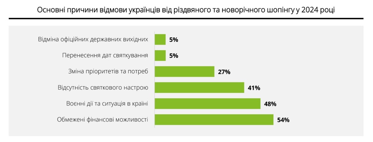 У 2024 році пріоритетом під час святкового шопінгу є економія бюджету. Власне серед основних причин відмови від святкових закупок українці вказують обмеженість фінансових ресурсів – 54%. Воєнні дії та загальна ситуація в країні, а також відсутність святкового настрою доповнили трійку відмов.