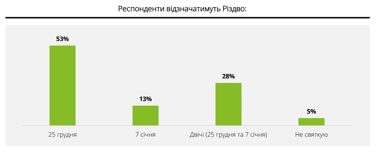 Примітно, що через перехід України на новий календар вже більше половини українців (53%) святкуватимуть Різдво 25 грудня і тільки 13% – 7 січня. Охочих погуляти двічі теж вистачає – їх 28%.