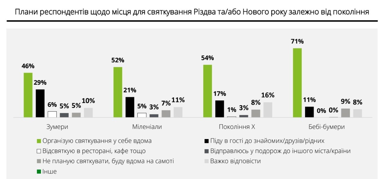 Також більше половини опитаних (54%) будуть святкувати у себе вдома, а ще 20% – підуть у гості до друзів чи знайомих. На святкування в ресторані чи під час подорожі розраховують лише по 3%. При цьому статистично найбільший відсоток бажаючих святкувати вдома фіксується серед бебі-бумерів – 71%. А чим молодші покоління тим більша в них схильність до походу в гості. Відповідно, у зумерів найбільше бажаючих зустріти Різдво чи Новий рік в гостях – 29%.
