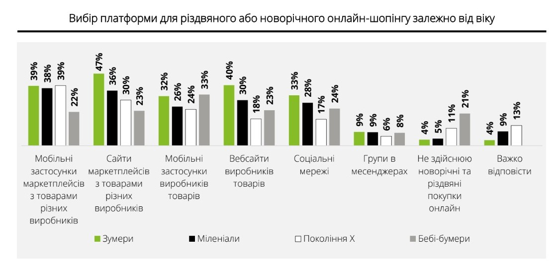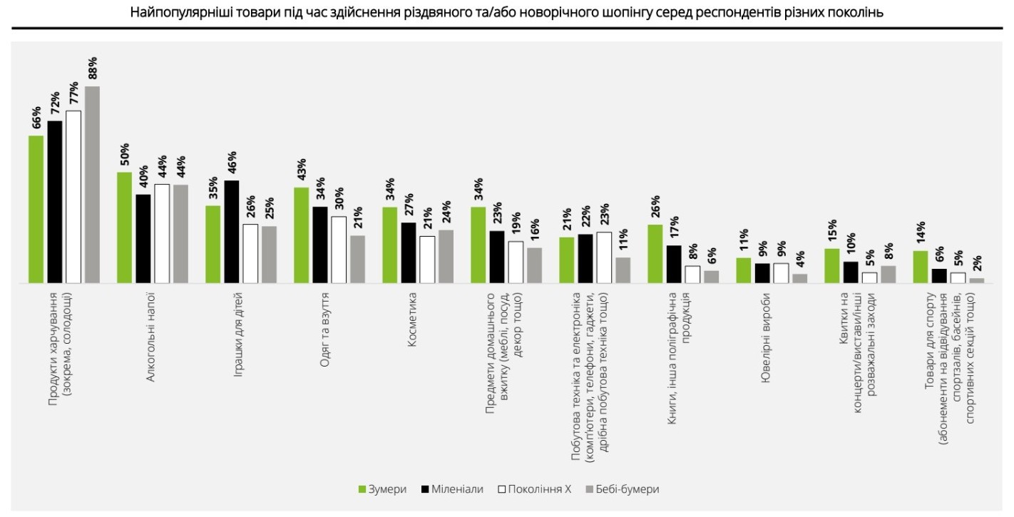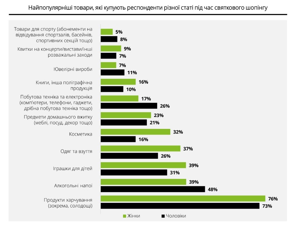 Водночас іграшки для дітей (третя за популярністю категорія з часткою 36%) найбільше цікавлять міленіалів. Так 46% народжених в 1980-х та на початку 1990-х налаштовані купувати іграшки. Практично в усіх інших видах товарів частка зумерів, готових купувати, більша за інші вікові категорії. Традиційно популярнішими серед жінок будуть покупки одягу та взуття (37%), косметики (32%), предмети домашнього вжитку (23%). Чоловіки ж виберуть одяг та взуття (26%) й побутову техніку та електроніку (26%).