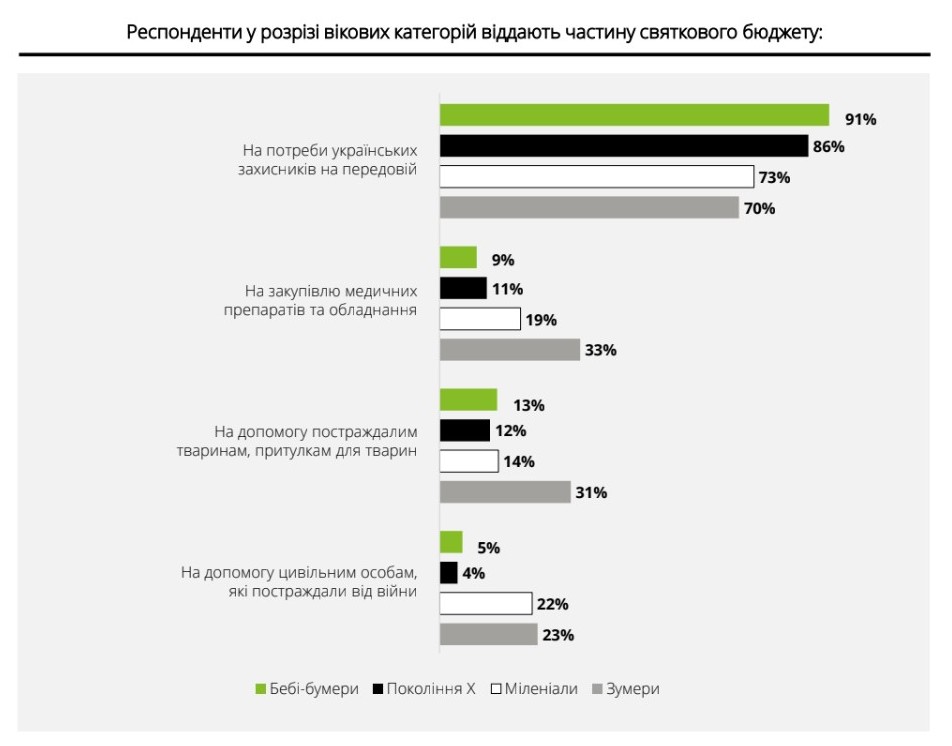 Зумери, міленіали та люди покоління Х за рахунок більшого святкового бюджету загалом планують охопити благодійністю більшу кількість напрямків. Зі свого боку 91% бебі-бумерів переказують кошти на допомогу захисникам на передовій.