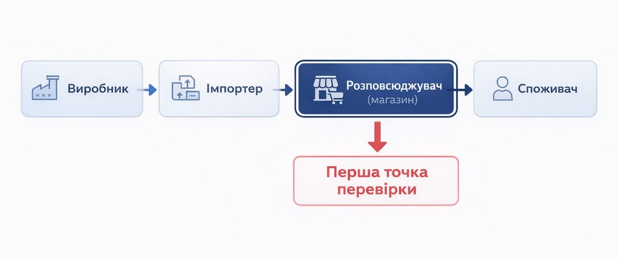 Причина – у самій логіці законодавства про державний ринковий нагляд. Воно побудоване за принципом руху по ланцюгу постачання: від розповсюджувача до імпортера (виробника). Саме тому ритейл виступає першою точкою входу для контролю. Закон покладає на розповсюджувача обов’язок діяти як мінімальний фільтр: перевіряти наявність базової інформації та документації про товар, забезпечувати можливість відслідкувати його походження і реагувати на виявлені порушення.