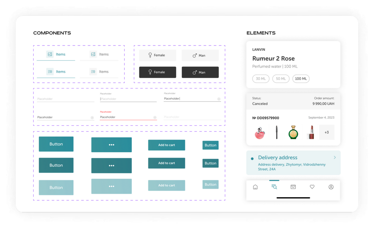 Перейшовши до фази дизайну, ми зосередилися на тому, щоб додати додатку яскравості та зручності у використанні. Водночас нам важливо було зберегти впізнавану візуальну ідентичність бренду Brocard. Тому ми розробили цілісну систему дизайну, яка складалася з бібліотеки стандартизованих елементів. Це гарантує єдину візуальну мову для всіх можливостей взаємодії із застосунком.