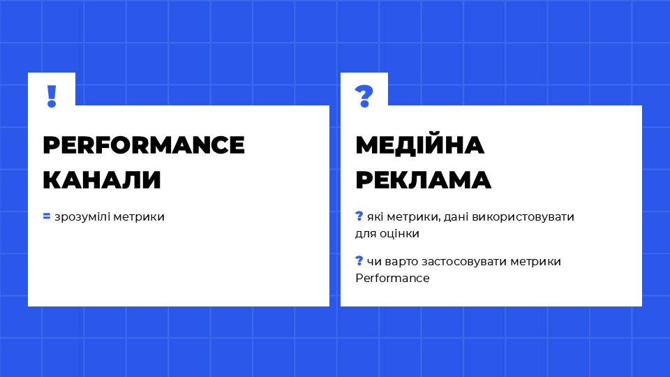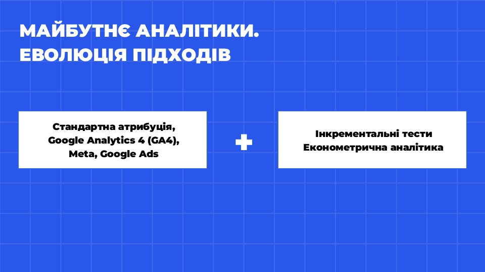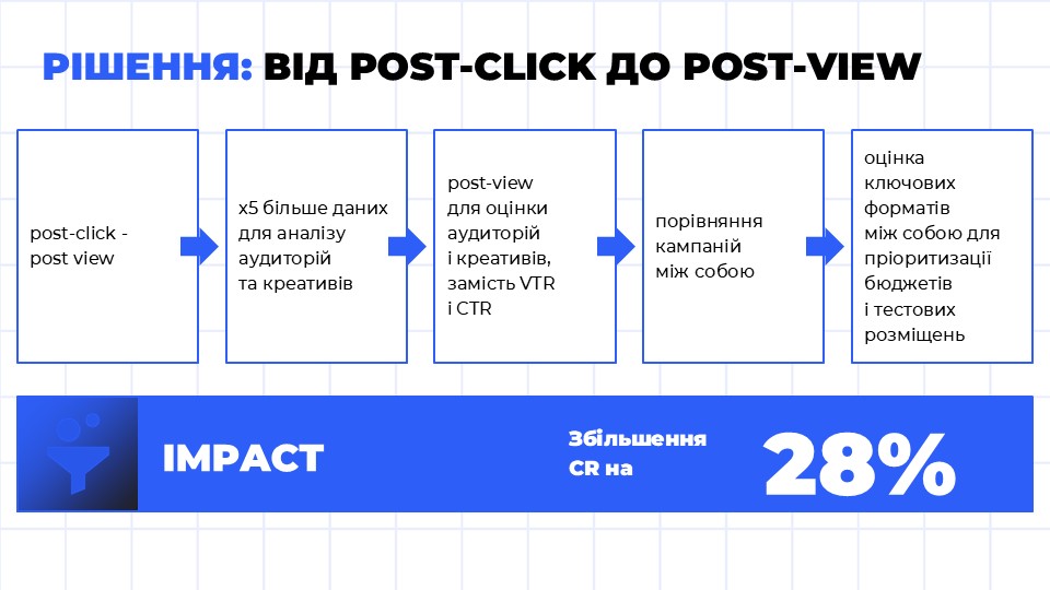У випадку з медійними форматами традиційно використовується post click підхід, який в умовах браку статистичних даних часто не спрацьовує. Натомість є post view підхід, реалізований в базі Google інструментів під назвою Campaign Manager, який дозволяє оцінювати різні канали (окрім сервісів Meta). Її можливості для аналізу аудиторії вп’ятеро більші.