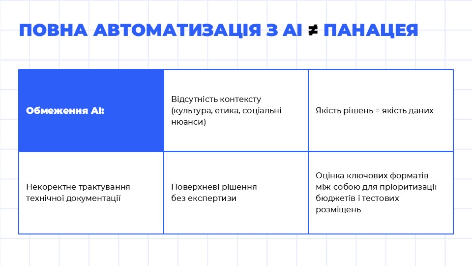 Сучасні ритейлери широко використовують штучний інтелект у своїй роботі. І здавалося б, з часом повна автоматизація маркетингу могла би стати новою реальністю. Проте далеко не все можна передати на обробку АІ. Тому що він не знає контексту: культури, соціології, може некоректно трактувати технічну документацію, а рішення – кардинально мінятися в залежності об’єму даних.