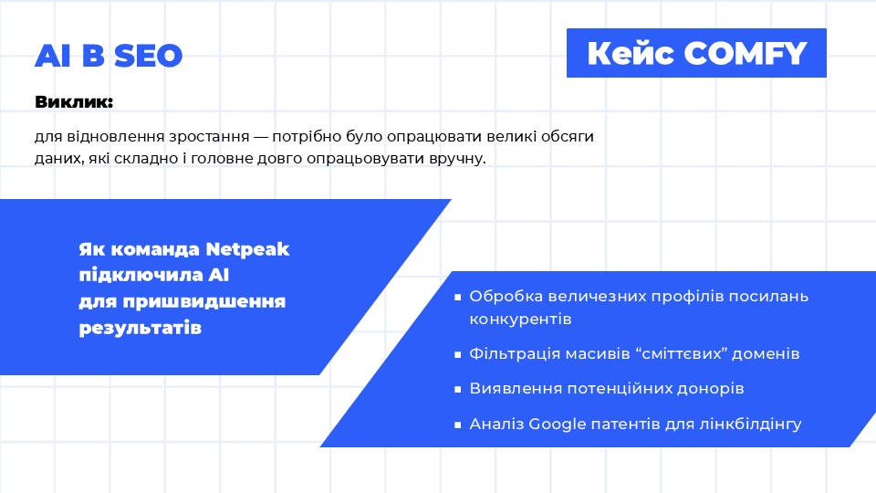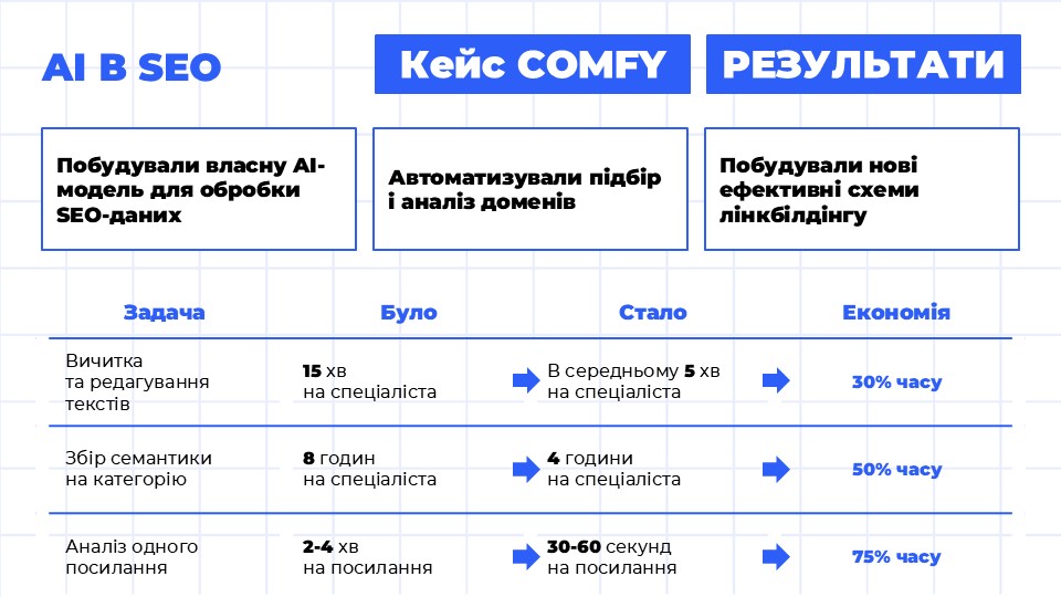 Як це було в компанії Comfy. Потрібно було проаналізувати дуже велику кількість семантики, профілів, посилань та іншої мета-інформації.